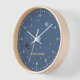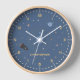 A blue wall clock on the space theme with planets, stars and a rocket in cartoon style. It comes with customizable forename, it will be a nice gift for kid's room decoration. This clock could also be place in a nursery or in a game room.
