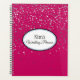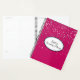 This planner notebook is shown with a petite silver-gray stars print on a bright Magenta background. Personalized name for you to customize to yours inside a White oval with dual coordinating colored borders of black and cornflower blue on the front. Back same color and stars print. Text is shown in Black.