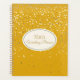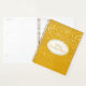 This planner notebook is shown with a petite Champagne stars print on a Mellow Yellow colored background. Personalized name for you to customize to yours inside an Ivory oval with dual coordinating colored borders on the front of willow green and ivory, matte gold text. Back same color and stars print.