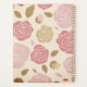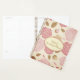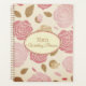 This planner notebook is shown with blush pink looking colored roses floral print on a ivory background and brown leaves. Personalized name for you to customize to yours inside an ivory oval with dual coordinating colored borders of golden and pink on the front. Back same color and rose floral print. Text is in golden. Select your binder spiral on the side, this one is shown with gold.