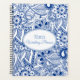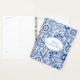 This planner notebook is shown with blue and white floral printed on front and back. Personalized name for you to customize to yours inside an white oval with dual coordinating colored borders of cornflower blue and periwinkle on the front. Back same color and rose floral print. Text is in cornflower blue. Select your binder spiral on the side, this one is shown with black.