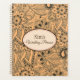 This planner notebook is shown with a peach and brown floral print on front and back. Personalized name for you to customize to yours inside an ivory oval with dual coordinating colored borders of peach, white and chocolate brown on the front. Back same color and floral print. Text is brown. Select your binder spiral on the side, this one is shown with gold.