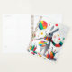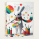 Discover a cute magical world where art comes to life with our charming 3D white rabbit graphic! This adorable bunny holds a paintbrush and a colorful palette, adorned with a long rainbow scarf around its neck. Surrounding the rabbit are various painting accessories like crayons and brushes, all in vibrant hues matching the rabbit's scarf. Set against a vintage white background, this enchanting scene is featured on a planner, ready to inspire your creativity every day!