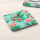 Hard plastic coaster is shown in a lovely flamingo tropical palms print.