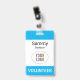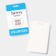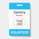 Personalize our professional plastic volunteer name badge with your event or organization logo, volunteer name, or other custom text. It's PVC plastic and available with a metal clip, lanyard, or a retractable reel. This sky blue name badge can be customized to a different color, and you can optionally add content to the back. No minimum order quantity and no setup fee.