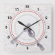 Designed for the modern kitchen, all granite and stainless steel, this wall clock features an illustration of a white enamel plate with red crackled glaze at the edges, and a thin red stripe around the border. The view is looking down from directly above the plate. A silver spoon and fork are on the plate, which sits on a white granite counter top textured with subtle colors. The black numbers on the clock can be cleared if you prefer a simpler, cleaner look. Matching Dishwasher Magnet available.