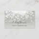 Chic modern design features a silvery gray background with a burst of white bokeh lights at the top. Add two lines of custom text to the front, with your name or business name in chic handwritten script, and customize the back with your full contact details.