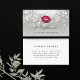 Chic modern design features a silvery gray background with a burst of white bokeh lights at the top and a dark pink lip print kiss. Add two lines of custom text to the front, with your name or business name in chic handwritten script, and customize the back with your full contact details. Perfect for makeup artists, aestheticians, lip color distributors or any beauty industry professional.