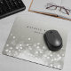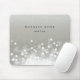 Chic personalized mousepad displays your name, business name or choice of custom text in classic black lettering on a silvery gray background adorned with a burst of white bokeh lights at the top.