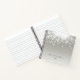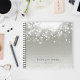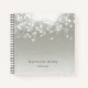 Chic notebook features a silvery gray background adorned with a burst of white bokeh lights at the top. Personalize with two lines of custom text along the bottom in classic black lettering.