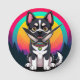 Illustration of a cheerful cartoon dog sitting in front of a colorful rainbow background, featuring a playful ambiance and surrounded by a serene forest landscape, emphasizing joy and vibrant artistry.