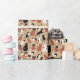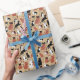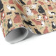 Wrapping paper in a variety of cute, stylized cats in various playful poses, colors, and patterns - tabby, black, white, and calico - set against a tan background. Scattered foliage and tiny hearts add playful accents to the design.