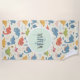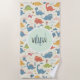 This playful beach towel features colorful, whimsical dinosaurs smiling in fun poses. A hand-drawn name label is in the center of the design.