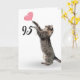 Gray tabby cat with pink heart balloon for 95th birthday on white background.