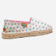 Add a pop of color to your wardrobe with this adorable pair of espadrilles! These cute shoes feature a delightful mix of multi-colored hearts that will add a touch of fun to any outfit. Playful hearts in shades of pink, blue, yellow, red, and green dance across a white background, making these espadrilles a cheerful addition to your shoe collection.