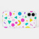 This phone case features a playful Memphis-style pattern filled with neon circles, triangles, and abstract shapes in pink, turquoise, green, and yellow. Inspired by retro 80s design, it adds a vibrant and energetic look to your device. Perfect for anyone who loves colorful and modern geometric art.