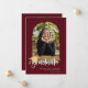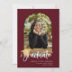 Playful white script with golden graduation cap accent, arch frame 2 photo graduation announcement/invitation. Features, burgundy red color background.