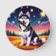 Vivid colorful artwork depicting a happy Siberian Husky under a magical, starlit evening sky amidst blooming flowers in a serene meadow, showcasing a whimsical harmony of nature and playfulness.