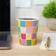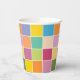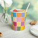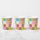 Colorful checkered paper cups designed with various shades of yellows, orange, greens, lavender and blue.