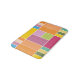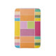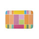Colorful geometric blocks bath mat designed with various shades of yellows, orange, greens, lavender and blue.