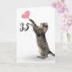 Gray tabby cat with pink heart balloon for 35th birthday on white background.