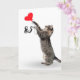 Gray tabby cat with red heart balloon for 85th birthday on white background.