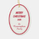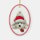 On the front of this Christmas ornament is an image of an adorable West Highland White Terrier wearing a red and white Santa hat. The Westie has found a Holiday tree bulb that looks like a Santa Claus suit, and is ready to play. The image is placed on a white background with a red double lined oval frame. The back of the ornament has the same border frame with your custom text contained in several fields.