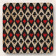 Red hearts and diamonds and black clubs and spades on a background of black and tan diamond shapes. Make sure to check out the matching throw pillows!