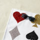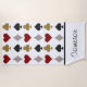 This custom beach towel features a poker or casino playing cards theme with the symbols for the various suits. The hearts are printed in red, the clubs in gold, the spades in black, and the diamonds in silver. The images are printed in a tiled pattern across the rug. A sample name is printed at the bottom. You can personalize the towel to include your own custom name or other text.