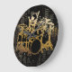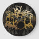 Contemporary wall clock featuring a drummer in action. The colors are black and gold.