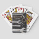 Playing cards with photograph of mechanic's tools (nut wrenches, nuts, and bolts) on top of a reflective carbon fiber surface