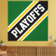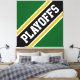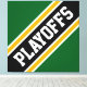 This sporty football design features athletic PLAYOFFS text inside highlighted wide diagonal black, white, and golden yellow orange racing stripes against forest green background. The colors and text in this design can be personalized.