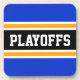 This sporty, colorful design features athletic PLAYOFFS text inside a highlighted wide black stripe with white and yellow orange racing stripes against outer vivid blue stripes. The text and colors in this design can be personalized.
