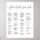 Wedding guest seating chart in classic black and white features "please find your seat" at the top in whimsical handwritten calligraphy script lettering, with your guest table assignments beneath, arranged alphabetically across four columns.