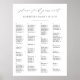 Wedding guest seating chart in classic black and white features "please find your seat" at the top in elegant calligraphy script lettering, with your guest table assignments beneath, arranged alphabetically across four rows. Accommodates up to ~100 guests; use the design tool to reduce font size if more space is needed.