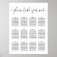 Wedding guest seating chart in classic black and white features "Please find your seat" at the top in whimsical handwritten calligraphy script lettering, with your guest table assignments beneath. Space provided for up to 12 tables.