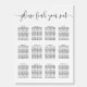 Wedding guest seating chart in classic black and white features "Please find your seat" at the top in whimsical handwritten calligraphy script lettering, with your guest table assignments beneath. Space provided for up to 12 tables.