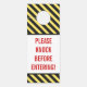 This design features the message "PLEASE KNOCK BEFORE ENTERING!" in bold red text, along with yellow and black colored alert stripes.