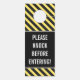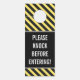 This design features the message "PLEASE KNOCK BEFORE ENTERING!" in bold white text, along with yellow and black colored alert stripes.