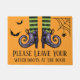 Fun, cute and cleaver halloween theme doormat. Our design features our own illustration of stylized witch boots and legs peeking from the top of the doormat against a bright orange background to create a fun, quirky halloween theme doormat design. Bats and spider web elements add to the halloween theme. "Please leave your witch boots at the door" is displayed below. All illustrations contained in this fun, cute and cleaver halloween theme witch doormat are hand drawn original artwork by Moodthology. You can customize the text size, text colour, font and layout for your own personal design preference.