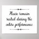 This charming print features the phrase "Please remain seated during the entire performance" in a handwritten black font and accented on top and bottom. Imagine the look on everyone's face when they see this above the toilet!