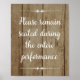 This charming print features the phrase "Please remain seated during the entire performance" in a handwritten white font and accented on top and bottom, on a rustic faux wood background. This is a humorous way to decorate a bathroom or washroom.