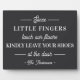 A cute typography based design with an important message asking guests to remove their shoes at the door. Sign reads "Since little fingers touch our floors, kindly leave your shoes at the door" in retro lettering. Personalize with your family name along the bottom.