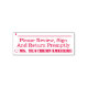 This basic rubber stamp design features the message "Please Review, Sign And Return Promptly", along with a line that a signature or initials could be written above. It also features a personalized teacher’s or educator’s name. It could perhaps be used by a teacher, educator or tutor to ask a student’s parent(s) or guardian(s) to review and acknowledge the mark that a student received on a test, quiz, paper, or some other school assignment.