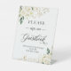 Please Sign Our Guestbook White Rose Gold Floral Pedestal Sign. The default size is 8 x 10 inches, you can change it to other sizes. For further customization, please use Zazzle's design tool to modify this template.