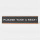 This classic design features the message "PLEASE TAKE A SEAT!". This could be used in a waiting room to inform clients or visitors that they will be helped shortly, and that they should take a seat in the meantime.