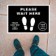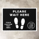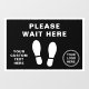 Simple black "Please Wait Here" floor decal sign featuring an illustration of white shoe prints, your logo and a customizable line of your text in clear, easy to read white typography.