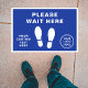 Blue "Please Wait Here" floor decal sign featuring an illustration of white shoe prints, your logo and a customizable line of your text in simple white typography.