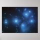 Pleiades is star cluster located in the constellation Taurus and is amongst the nearest and brightest star clusters in the sky. It is about 440 light years away from earth and the cluster core has a radius of about eight light years. This is a true color image of the hot bright blue stars showing the nine most prominent. Image courtesy of NASA and the Hubble Space Telescope.