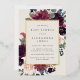 Chic floral baby shower invitation features a border of burgundy marsala purple, blush pink, and dusty blue flowers, with lush botanical foliage and greenery and gold foil trim. Personalize with your baby shower details in modern lettering on a rich cream ivory background.